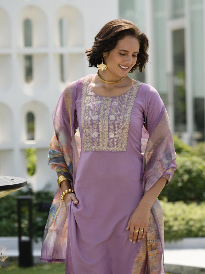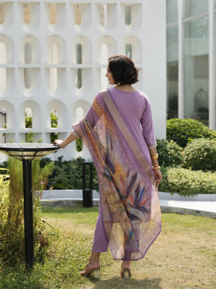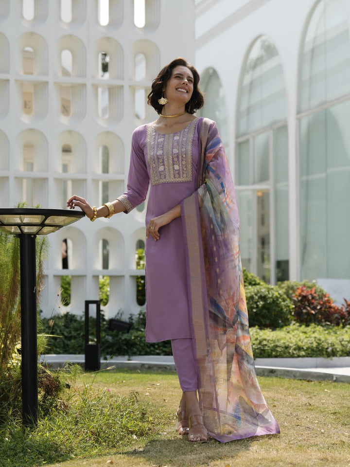 our Straight Kurti Pant Dupatta Set brings you the best of both worlds. Crafted for comfort and styled for versatility, it's a must-have for your summer wardrobe. SKU:- 2011 • Color : Lavender • Kurta Fabric : Viscos-Rayon with embroidered work • Neckline: as per image with embroidery • Sleeves: Three-quarter with embroidered cuffs • Dupatta Fabric:Organza jacquard with printed • Pant Fabric: Viscos-Rayon Size :- S,M,L,XL,XXL,3XL