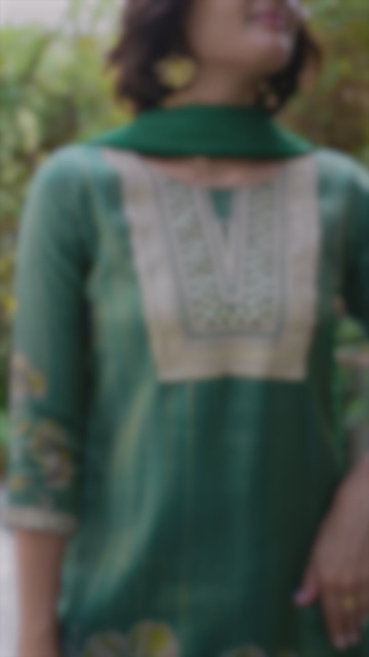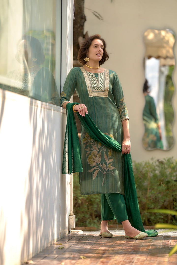 our Straight Kurti Pant Dupatta Set brings you the best of both worlds. Crafted for comfort and styled for versatility, it's a must-have for your summer wardrobe. SKU:- 2005 • Color : Green • Kurta Fabric : Tissue with floral print and embroidery • Neckline: as per image with embroidery • Sleeves: Three-quarter with embroidered cuffs • Dupatta Fabric: Viscose with embroidery • Pant Fabric: Viscose Size :- S,M,L,XL,XXL,3XL