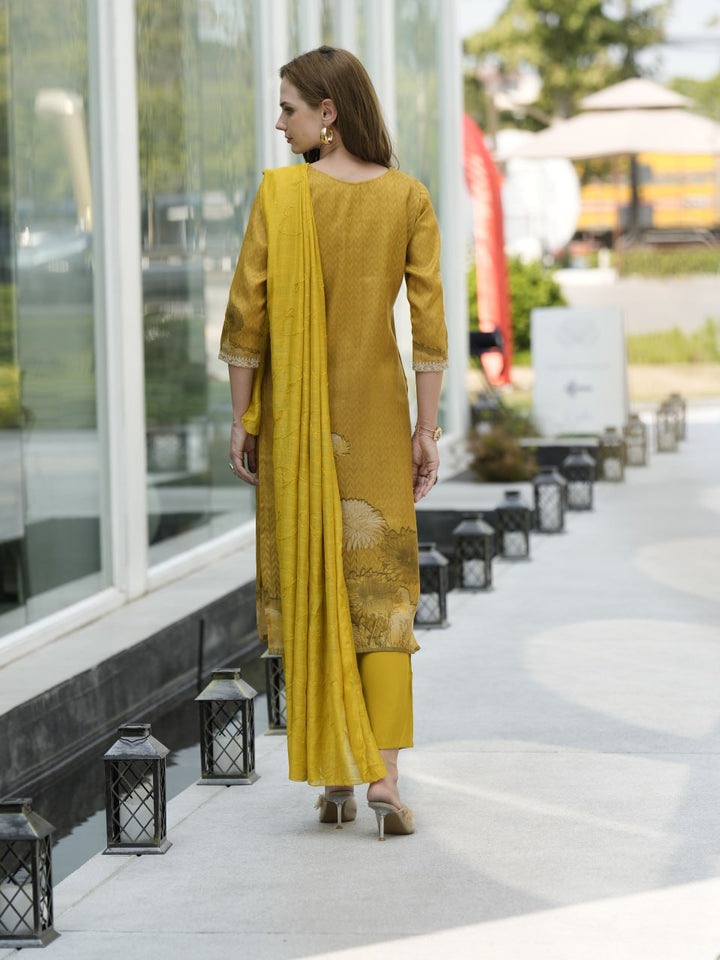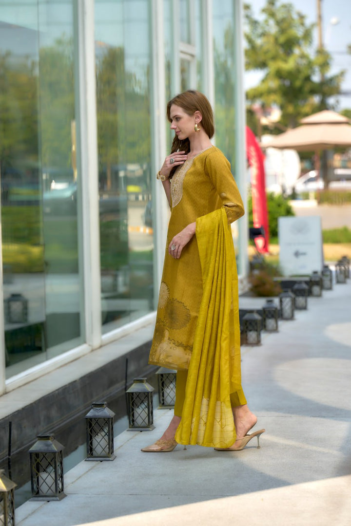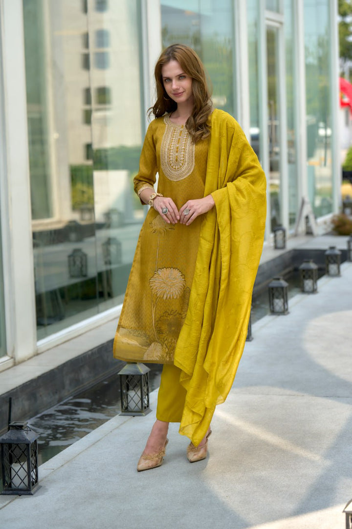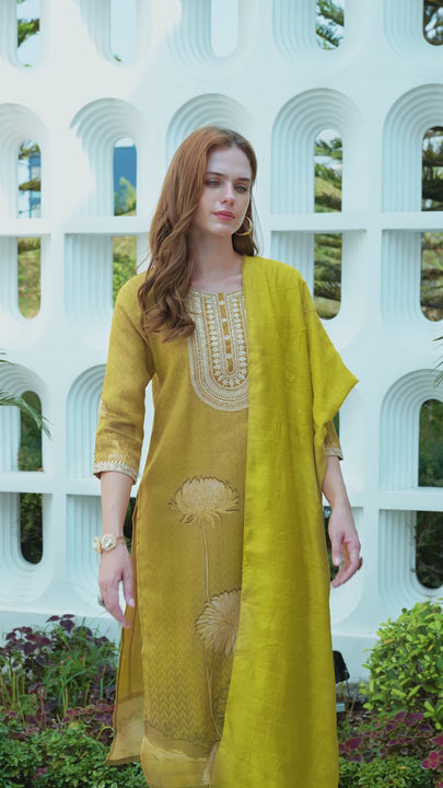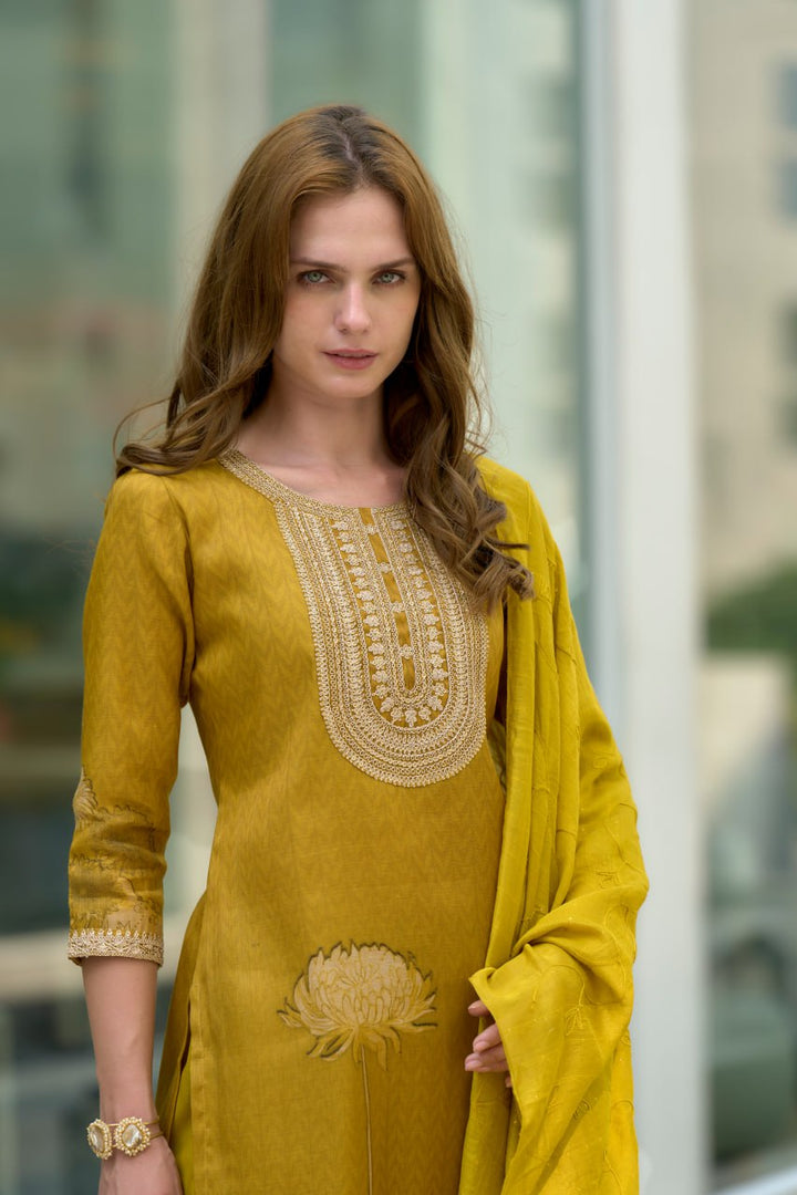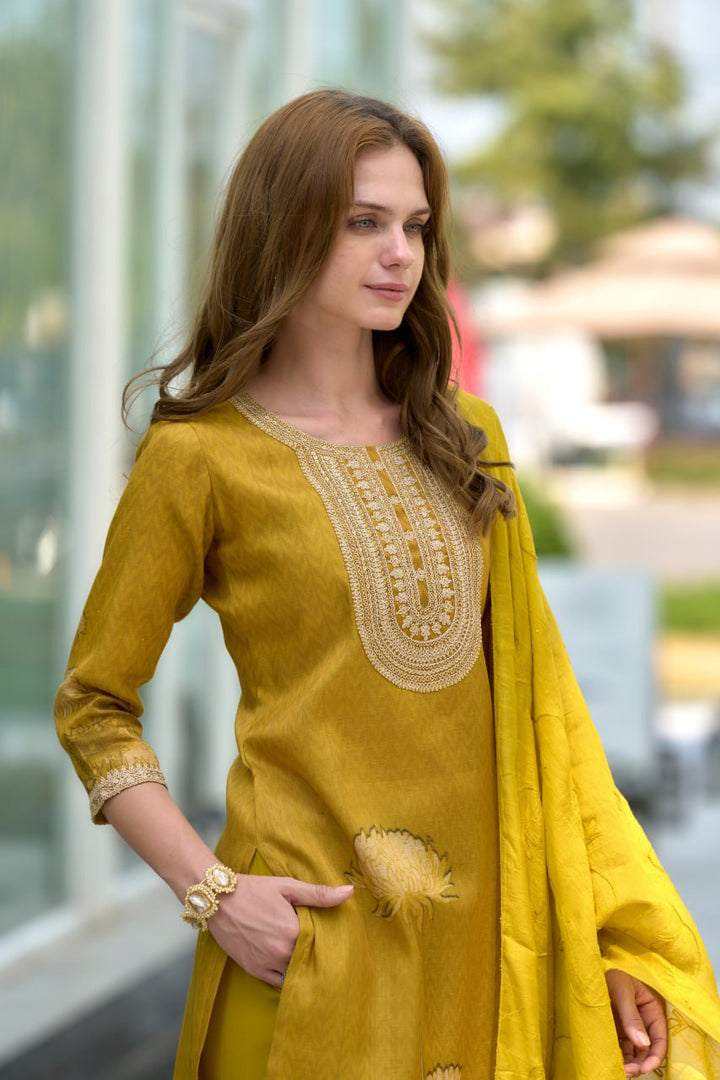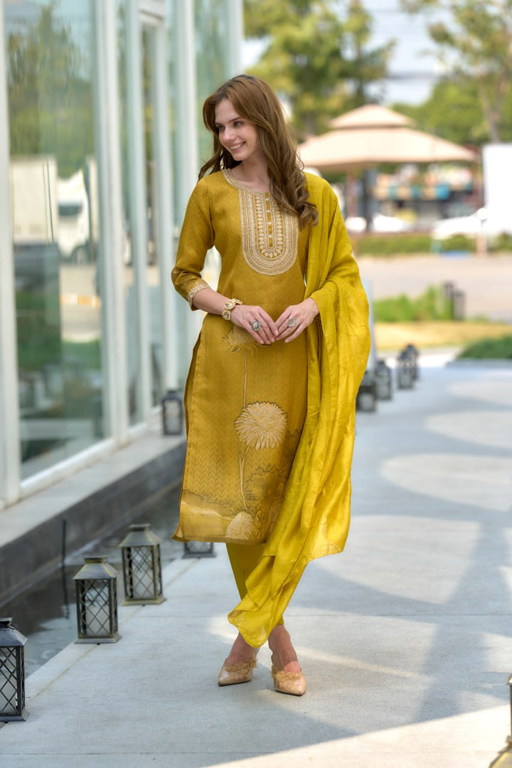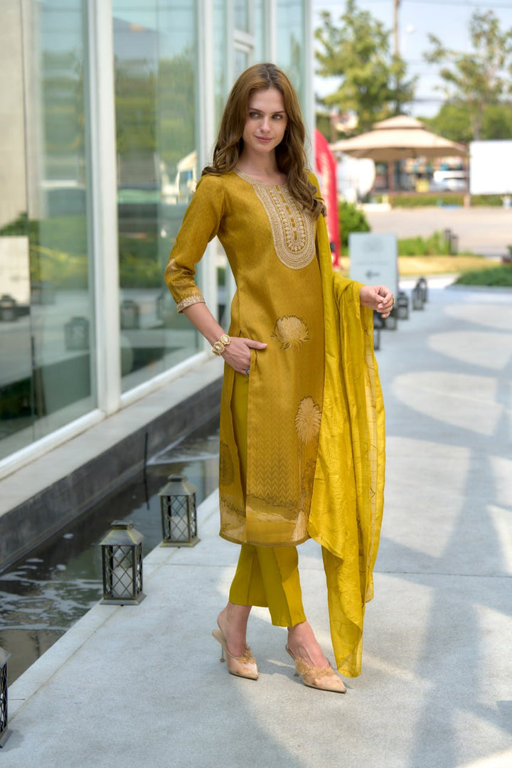 our Straight Kurti Pant Dupatta Set brings you the best of both worlds. Crafted for comfort and styled for versatility, it's a must-have for your summer wardrobe. SKU:- 2019 • Color : : Mustard yellow • Kurta Fabric : : Tissue with floral print and embroidery • Neckline: as per image with embroidery • Sleeves: Three-quarter with embroidered cuffs • Dupatta Fabric: Viscose with embroidery • Pant Fabric: Viscose Size :- S,M,L,XL,XXL,3XL
