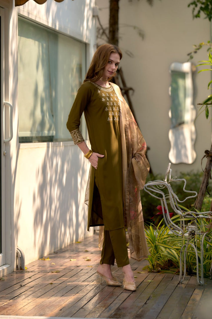 our Straight Kurti Pant Dupatta Set brings you the best of both worlds. Crafted for comfort and styled for versatility, it's a must-have for your summer wardrobe. SKU:- 2016 • Color : : Mehndi • Kurta Fabric : : Rayon with embroidered work • Neckline: as per image • Sleeves: Three-quarter with embroidered cuffs • Dupatta Fabric: Organza jacquard with printed • Pant Fabric: Rayon Size :- S,M,L,XL,XXL,3XL