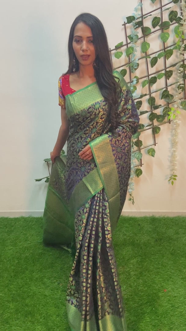 Fabric 🧶:- PURE PATOLA SILK SAREE WITH ALL OVER CONTRAST PATOLA WEAVED WITH CONTRAST MEENAKARI AND RICH PALLU WITH TASSELS ATTACHED