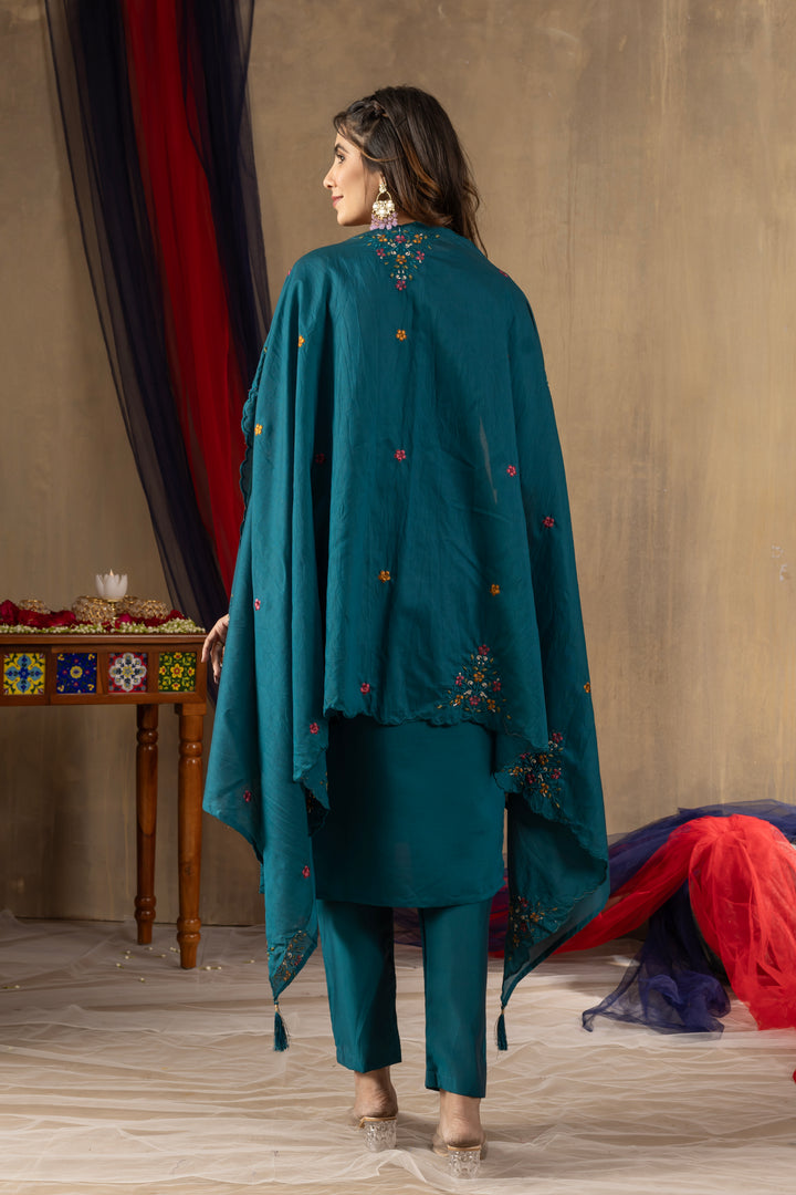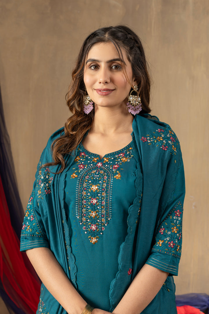 Elegant Straight Kurti Pant Dupatta Set Celebrate the season in style with our Straight Kurti Pant Dupatta Set — where traditional charm meets modern finesse. Lightweight, elegant, and versatile, it’s ideal for everything from brunches to celebrations. DIVA-106 Kurti (Stitched) Fabric :- Roman Silk Work :- Multi Embroidery Thread With Hand Work Chest Size :- M(38”),L(40”),XL(42”),2XL(44”),3XL(46”) Length :- 46” Sleeve Length :- 16” Pant (Stitched) Fabric :- Roman Silk Work :- Multi Embroidery Thread Fit :- Straight-Cut Pant for a sleek look Length: 38” Dupatta Fabric :- Chanderi silk Work :- Multi Embroidery Thread Length :- 2.5 Meter Package Contains :- Kurti, Pant, Dupatta Weight: 0.750 kg COLOUR:- 4 (Rama Green, Mustard,Rani Pink,Win