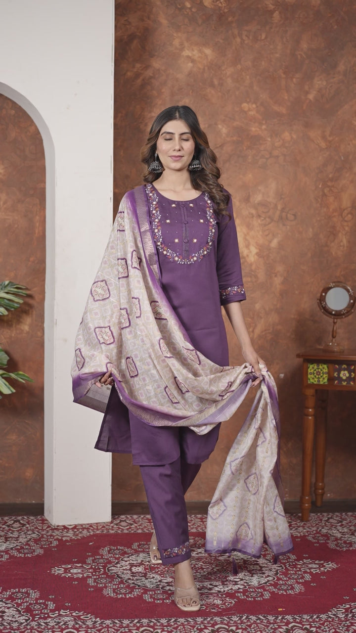 Elegant Straight Kurti Pant Dupatta Set: DIVA-101 This summer, embrace timeless elegance with our beautifully designed Straight Kurti Pant Dupatta Set, crafted with modern aesthetics and comfort in mind. Whether it's a casual outing or a festive celebration, this ensemble is the perfect fusion of tradition and contemporary style. Product Details Kurti (Stitched) *Fabric :- Marina Silk *Work :- Multi Embroidery Thread With Hand Work *Chest Size :- M(38”),L(40”),XL(42”),2XL(44”),3XL(46”) *Length :- 46” *Sleeve Length :- 16” Pant (Stitched) *Fabric :- Marina Silk *Work :- Multi Embroidery Thread *Length: 38” Dupatta:- *Fabric :-Maslin *Work :- Digital Print *Length :- 2.5 Meter *Package Contains :- Kurti, Pant, Dupatta *Weight: 0.750 kg *COLOUR:- 6 (Wine, Parrot Green, Off White, Lavender, Purple, Peach)