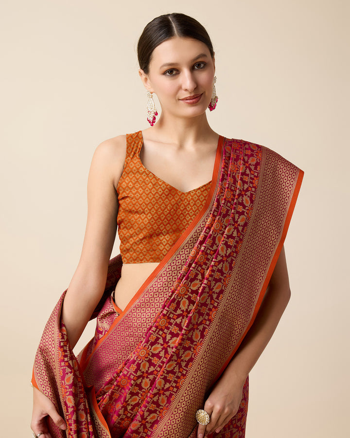 The opulent pallu and wide border are detailed with traditional Banarasi patterns, including floral vines and temple motifs, lending a timeless grandeur. It comes paired with a contrasting rust-orange blouse piece that complements the deep tones of the saree, enhancing the overall ensemble.