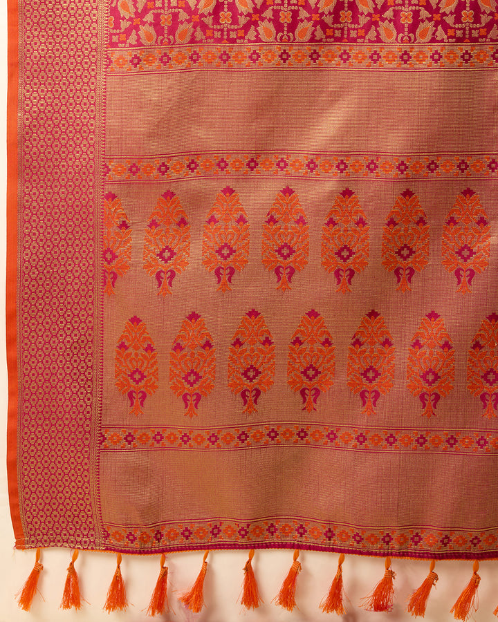 Grace your festive moments with this luxurious Maroon Banarasi Woven Silk Saree, a perfect blend of cultural elegance and royal finesse. Crafted from premium woven silk, the saree features a rich maroon base beautifully adorned with intricate floral zari motifs in shades of gold and deep pink, offering a regal and vibrant aesthetic.