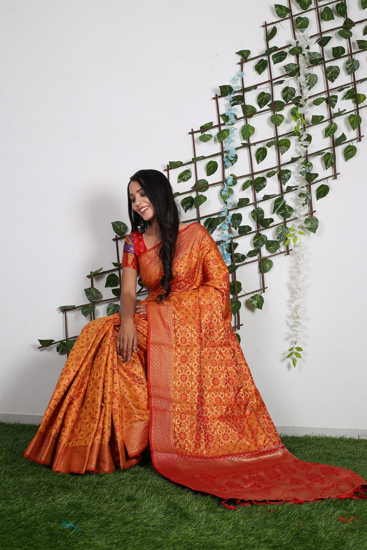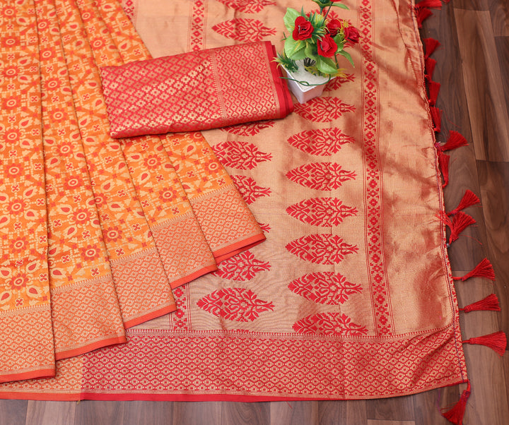 Fabric 🧶:- PURE PATOLA SILK SAREE WITH ALL OVER CONTRAST PATOLA WEAVED WITH CONTRAST MEENAKARI AND RICH PALLU WITH TASSELS ATTACHED