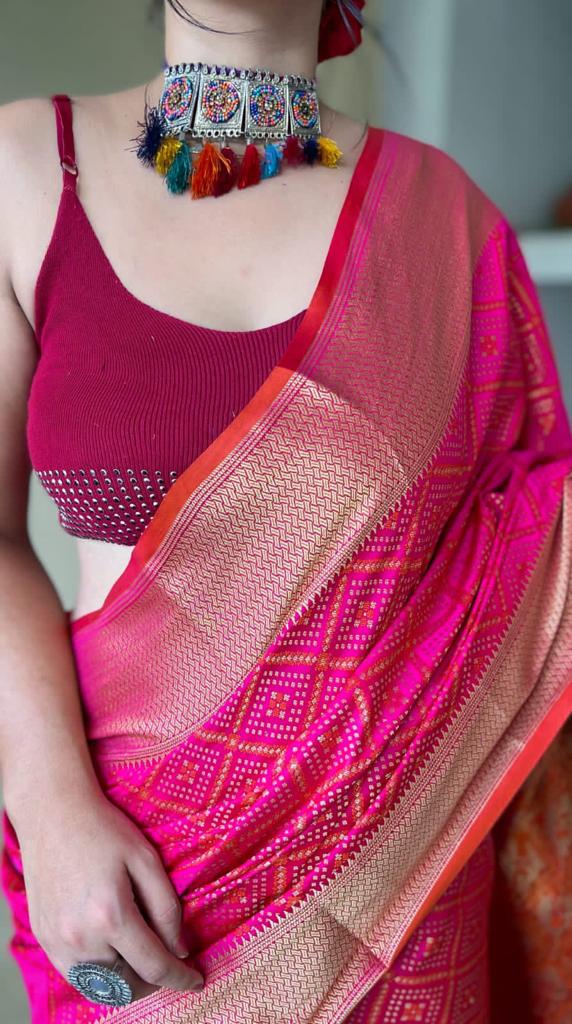 Fabric 🧶:- PURE PATOLA SILK SAREE WITH ALL OVER CONTRAST PATOLA WEAVED WITH CONTRAST MEENAKARI AND RICH PALLU WITH TASSELS ATTACHED