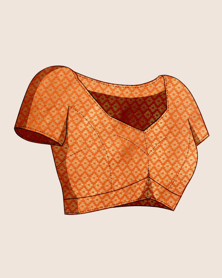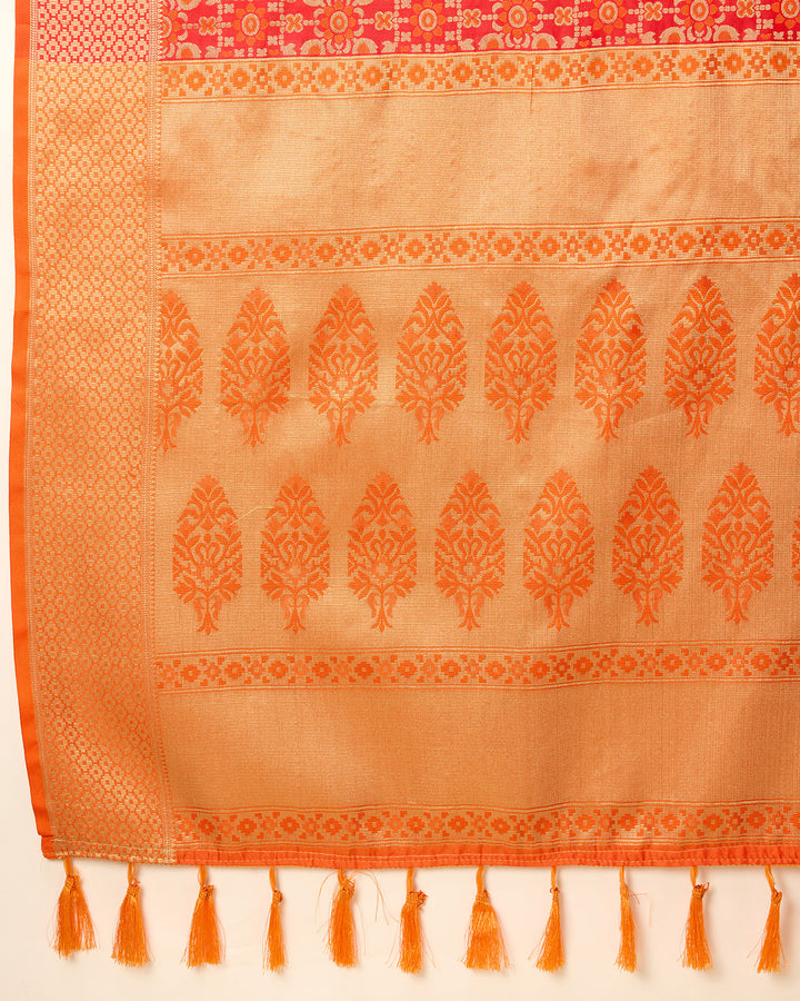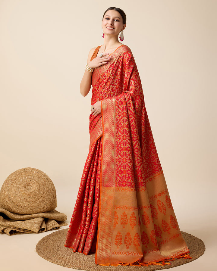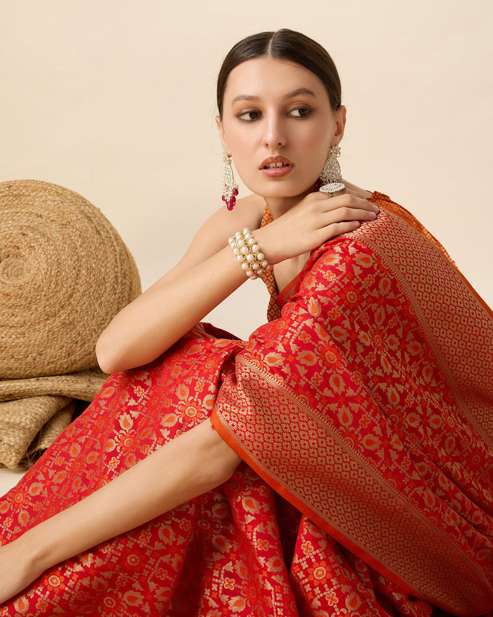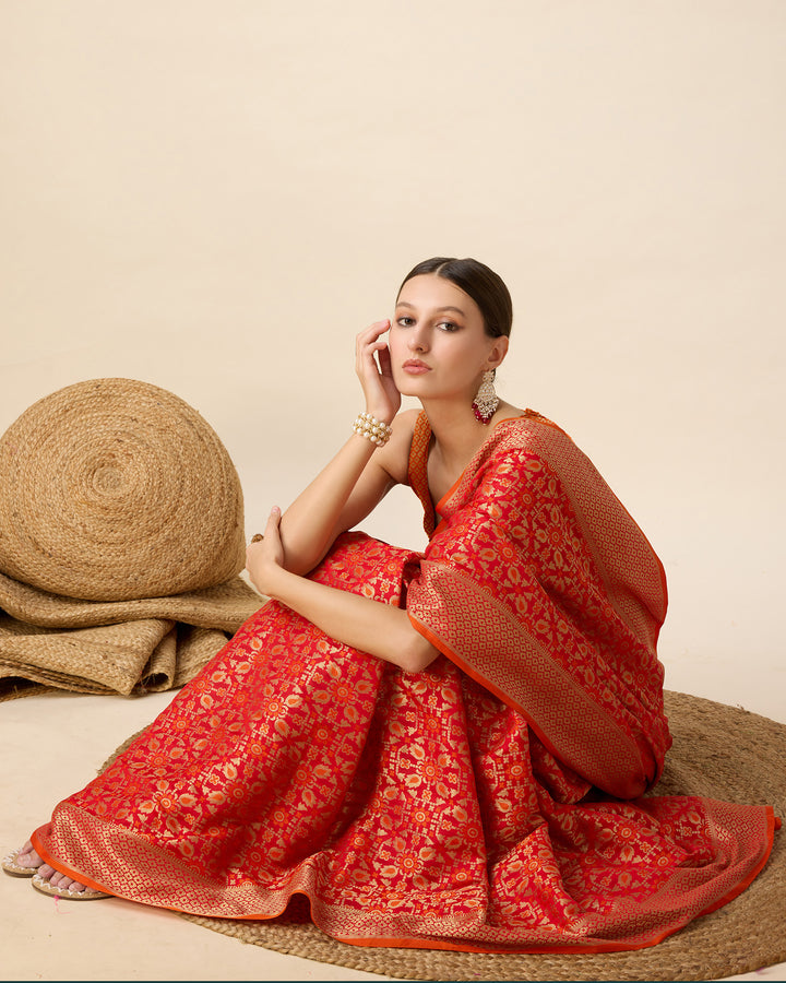 Make an unforgettable impression with this Radiant Red Banarasi Silk Saree, crafted to capture the essence of traditional luxury and elegance. Woven from premium Banarasi silk, the saree boasts a vibrant red-orange hue adorned with exquisite gold zari floral motifs spread gracefully across the body.