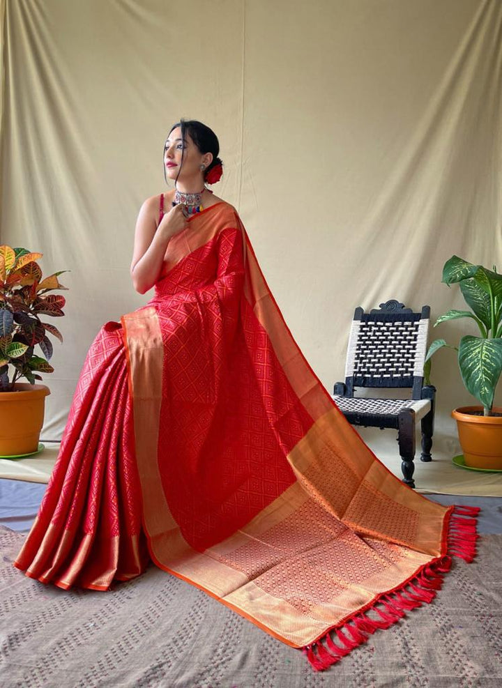 Fabric 🧶:- PURE PATOLA SILK SAREE WITH ALL OVER CONTRAST PATOLA WEAVED WITH CONTRAST MEENAKARI AND RICH PALLU WITH TASSELS ATTACHED