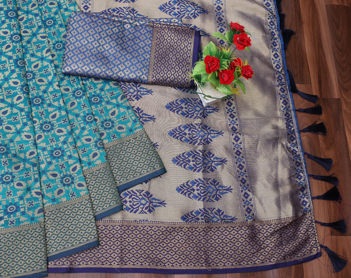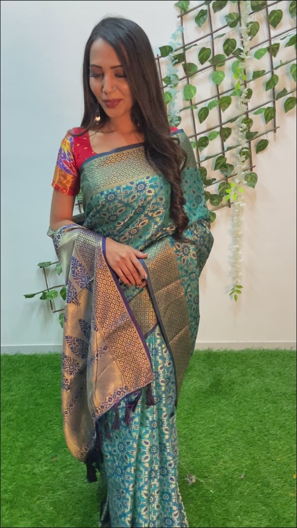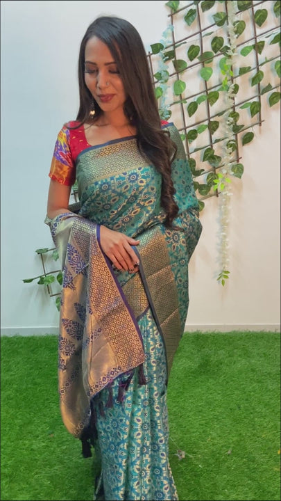 Fabric 🧶:- PURE PATOLA SILK SAREE WITH ALL OVER CONTRAST PATOLA WEAVED WITH CONTRAST MEENAKARI AND RICH PALLU WITH TASSELS ATTACHED