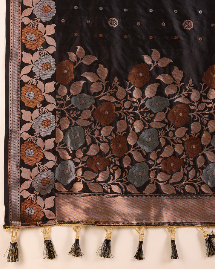 Fabrice PURE Jacquard fabrics with Sona Chandi pure zari work with a bouquet of vibrant 3 zari and pure WEAVE. the crisp and sheer SOFT saree fabric is woven with glistening zari jharokha, making it a perfect pick for designing a wedding and festive ensembles collection