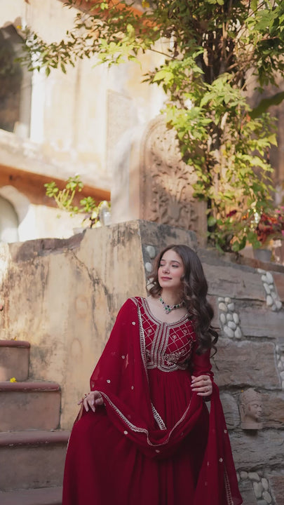 Faux Blooming gown with Sequins-Multi And Beads Embroidered Work, It looks graceful for women, it Designed to flatter all body types, gowns for women combine the best parts of western and Indian wear into one stunning ensemble. Code :- LW-9220 GOWN :- FABRIC & WORK :- Faux Blooming With Sequins-Multi & Beads Embroidered Work SIZE :- M(38''),L(40''),XL(42''),XXL(44'') LENGTH :- 56 INCH FLAIR :- 3.5 MTR LINING :- Cotton (Full Inner Top To Bottom) SLEEVES TYPE :- Regular Full Sleeve NECK TYPE :- Fancy Neck STITCHING TYPE :- Standard Stitch DUPATTA :- FABRIC & WORK :- Faux Blooming Georgette With Rich Sequins Multi Embroidered Lace Border . Length :- 2.3 MTR Colour :- 2 (Maroon,Purple) PACKAGE CONTAIN :- Gown, Dupatta WEIGHT :- 0.900 KG